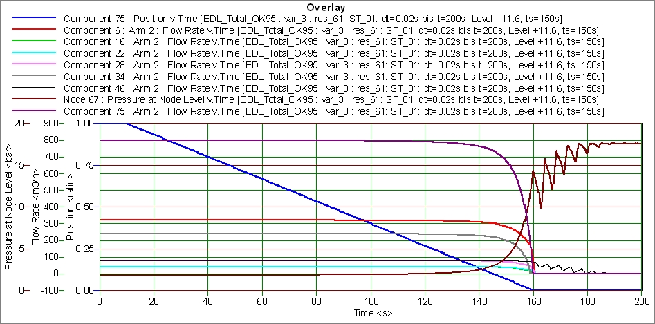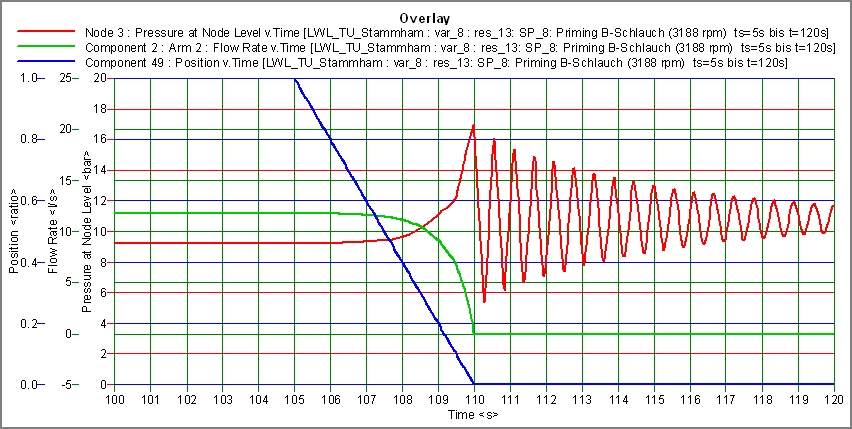 Abbildung 10: Bei dieser Berechnung betrug die Schließzeit der eingesetzten Armatur an einer Löschwasserentnahmestelle nur ts=5s. Man erkennt den dadurch provozierten Druckanstieg. Die Simulation hat den Nachweis erbracht, dass trotz der kurzen Schließzeit die Nenndruckstufe eingehalten wird.